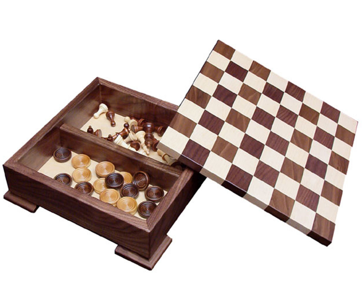 • Wooden chess and checker pieces are included