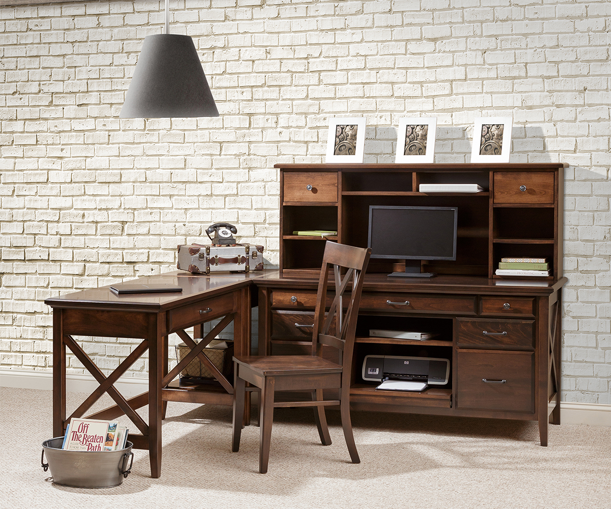 The Newport desk group combines contemporary furniture styles with the rustic. Creating an intricate design on the side panels and raised drawer fronts