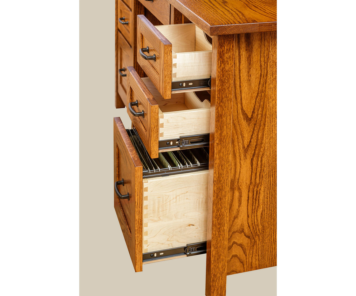 • Writing tray pullouts above each drawer stack